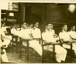 Ese día fue muy especial para mí. Era el siete de enero de 1964, en el aeropuerto me encontré con mi compañero de 2do bachillerato el Oso Porras y otro compañero del colegio que ingresaba con el M-14, Jesús Navarro. No conocía a nadie más. Viajamos en Aerocondor y mi compañero de puesto fue Sigifredo Velandia Rocha. Al llegar a Cartagena, después de la escala en Barrancabermeja, nos recibió el Sr. Teniente de Corbeta Juan Peláez Uribe, oficial recién graduado en la Academia Naval de Annápolis, nos llevaron a la escuela a recibir el equipo, el almuerzo fue espectacular, arroz de cerdo en abundancia y allí cometí mi primer error de apreciación: creí que el puesto clave en la mesa del comedor era el último, por la cantidad de comida que ese día sobró. (Claro el “Gorilín” Quintero aún esta en vacaciones)