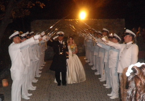 ![]() ![]() Se festejó en "La Iguana", del Club Naval, el matrimonio del TN Francisco Castañeda y Mónica Ruiz. El novio es hijo del BG IM Jesús Castañeda y Mabel. En la primera foto se registra la "bóveda de acero" a la salida de la ceremonia religiosa. En la siguiente, los novios posan con el señor Almirante Mauricio Soto, CN Jaime Sánchez, Dr.Carmelo Cuesta, CR IM José Calderón, CR Carlos Sánchez, Carmen de Soto, Yolanda de Sánchez y Sally de Cuesta.