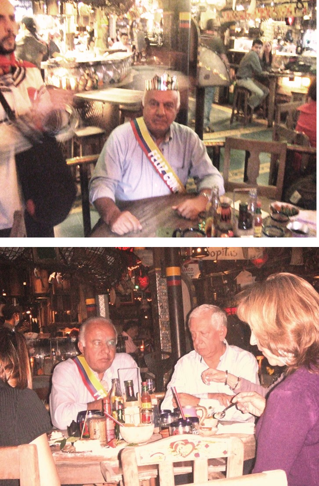 En dÃas pasados me encontré con el Coronel Sandoval, y familia, muy escondiditos, celebrando un cumpleaños más en “Andrés Carne de Resâ€?, como se puede ver, fue coronado y lo acompaña Coronel Ricardo Escobar y Carmiña. (Yo no salgo pues estaba con la cámara)