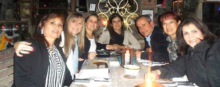 Ana Victoria Restrepo Capacho, Aixa Ximena Rodriguez Gutiérrez, María Patricia Rodriguez Ocampo y Claudia Lucia Rodriguez rodeando al Contralmirante Evelio Enrique Ramírez Gáfaro, en “Andrés Carne de Res” (Chía, Cundinamarca)