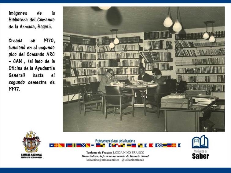 La primera creada en 2004 y reforzada con una celosa y dinámica Jefe en 2009, tiene como objetivo general "Resaltar la importancia histórica de la Armada Nacional", y entre sus 31 tareas específicas valen realzar: "Garantizar la conservación y custodia de los bienes del patrimonio Histórico Militar" y "Preservar y mantener el archivo histórico, con la debida explotación de sus fuentes". El segundo mencionado, creado en 2005, es un importantísimo órgano consultor externo de carácter honorario, compuesto a la sazón por nueve distinguidos miembros, entre los que se encuentra nuestro compañero y amigo Director de esta formidable Cyber Corredera, amante innato de la Historia, quien siendo Vicepresidente del Consejo, cuenta con los instrumentos y certeramente maneja sus influencias junto con sus colegas, en aras de la loable tarea de restauración de la Biblioteca.