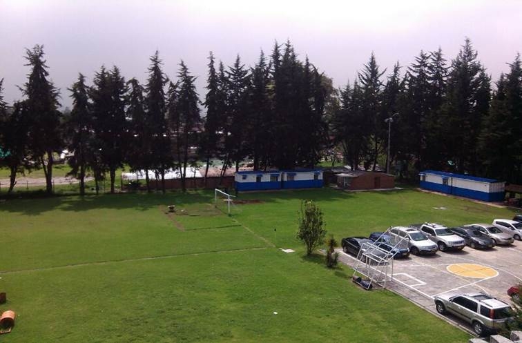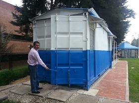 Vista de la ubicación de los 4 contenedores puestos al servicio de la Biblioteca, pintados en blanco y azul, en los campos deportivos de la Dirección General Marítima (DIMAR)