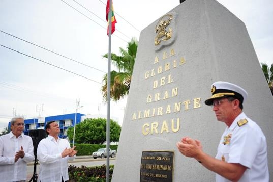 Develación del Monumento al Gran Almirante del Perú, Miguel Grau Seminario a cargo del honorable Néstor Popolizo Bardales Embajador del ?Perú?? en ??Colombia??, en compañía del Almirante Edmundo Deville del Campo, Comandante General de la Marina de Guerra del Perú, acompañados por el señor Jorge Dávila Pestaña, Cónsul Honorario del Perú en la ciudad ?Cartagena?? de Indias.