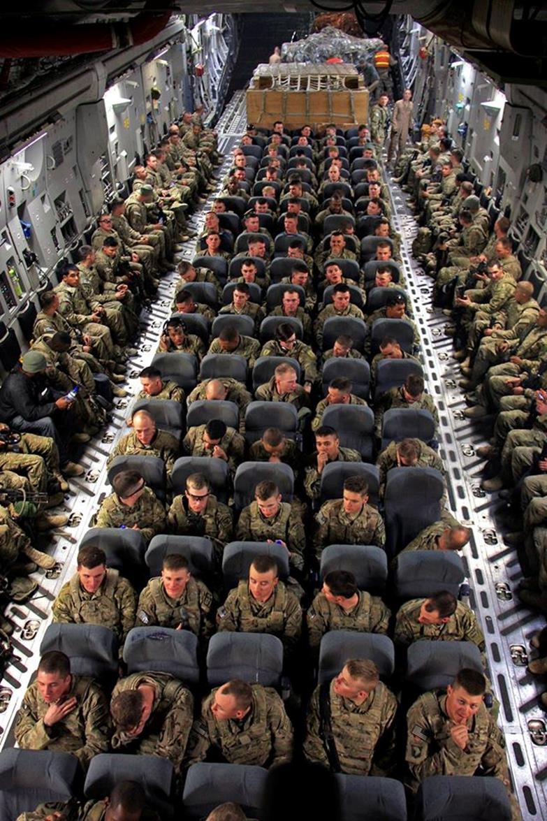 Esta es una fotografía de tropas estadounidenses en un avión C-17, acomodándose para volar a casa después de un viaje en Afganistán.