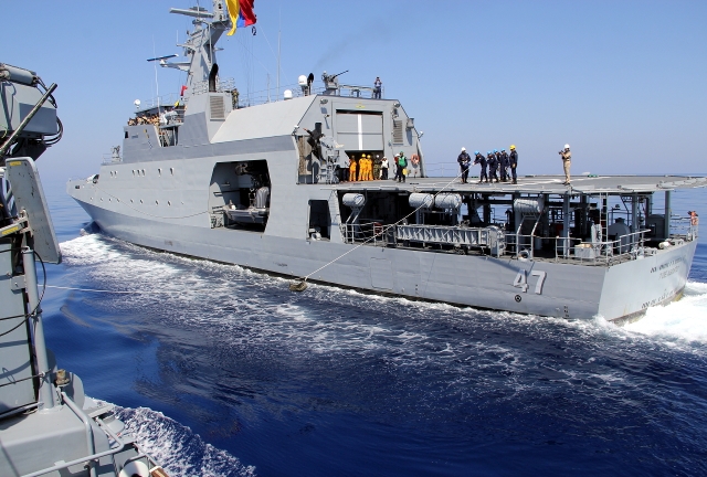 Reposición en el mar entre lancha rápida "Hiena" y la corbeta colombiana (Fuente: 2015 Armada Nacional de Colombia)