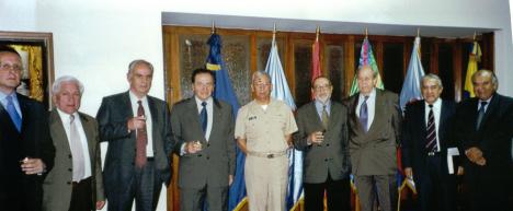 El señor Contralmirante Luis Carlos Jaramillo Peña, luego de su disertación histórica, acompañado de distinguidos miembros de la familia naval, asistentes a la sesión de la Academia Militar de Historia. En la fotografía aparecen de izquierda a derecha: TFRN Rafael Payán, CN Carlos Prieto, CN Gabriel Rueda Galvis, Calm Luis Carlos Jaramillo Peña, Alm Mauricio Soto Gómez -COARC-, Valm Guillermo Rueda Trujillo, Calm Miguel Cediel Navarro, Valm Enrique Ospina Cubillos, y Alm Alvaro Campos Castañeda.