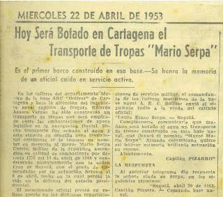 "" Dicho transporte fue echado al agua y acto seguido en sencilla pero tradicional ceremonia se le impuso su nombre en memoria de Mario Serpa, oficial del arma de caballería, ascendido póstumamente al grado de Mayor, en calidad de combatiente, por decreto 1278 del 19 de abril de 1948 y condecorado con la Cruz de Boyacá, en el grado de Comendador, por su actuación heroica el 9 de abril, fecha en la cual perdió la vida en la defensa del palacio presidencial cuando comandaba un escuadrón de tanques de guerra. Debido a su alto sentido humanitario y a su bondad sin límites, que no le permitían disparar sobre la multitud enfurecida, que en aquellos momentos se abalanzaba sobre palacio, el bravo oficial sin tener para nada en cuenta el riesgo que corría, salió del tanque que marchaba a la cabeza de sus tropas y trató de contener a los revoltosos con razones y no con la fuerza bruta de las ametralladoras y cañones que estaban provistos los tanques a su mando. En aquel momento la generosa acción del capitán Serpa fue pagada con tres disparos que le hicieron por la espalda. A la misma hora, en la "Clínica de la Magdalena", la joven esposa del héroe daba a luz al segundo de sus hijos y en esta forma la dama casi niña, sufría los dolores naturales de su estado a tiempo que sentía su alma desgarrada por la irreparable pérdida de su compañero, el gallardo capitán ""