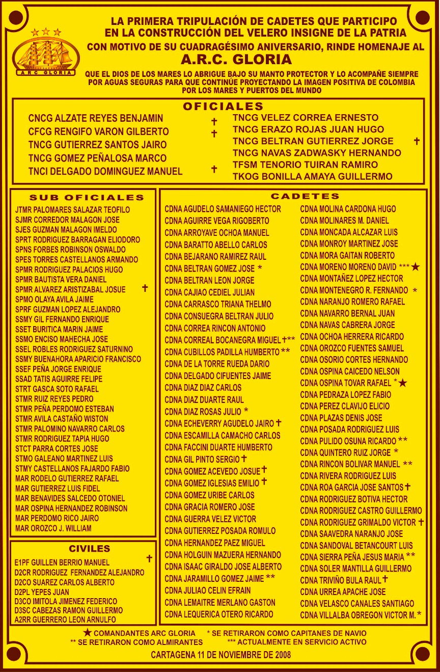 Zarpe ARC Gloria hacia Cano de Loro, ceremonia Imposición distintivo ARC Gloria a la Primera Tripulación, entrega de Placas y almuerzo abordo |
