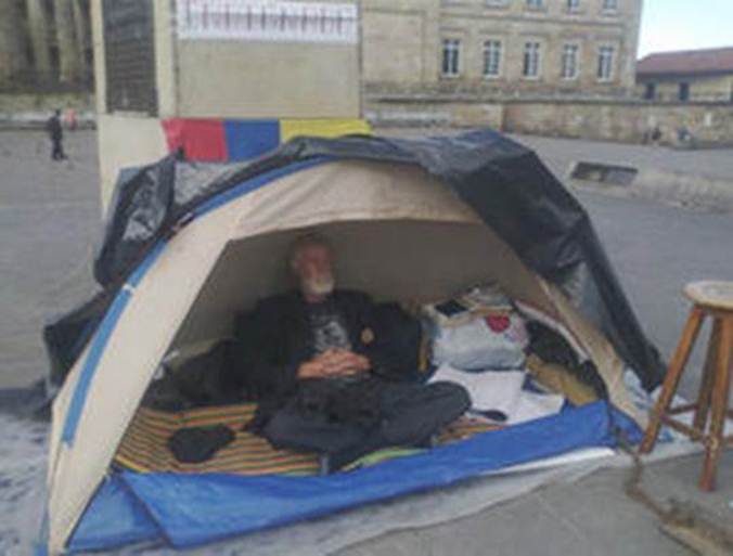 Dice que llegó desde San Jerónimo, Antioquia, donde tiene una pequeña finca, a Bogotá para protestar por la miseria, las injusticias y la violencia que vive Colombia y para llamar la atención del mundo y pedirle a los presidentes que asistirán a la Cumbre de las Américas en Cartagena, entre ellos a Barack Obama y Juan Manuel Santos, para que se hable con la guerrilla colombiana y se logre la paz en el paÃs.