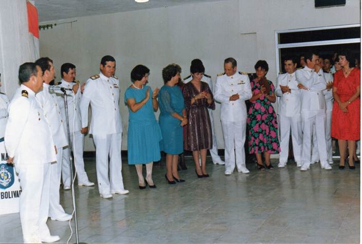 Agosto de 1985 Fiesta de despedida del Sr. CMN CNEU Mario Aranguren Ribón. Asume el comando del ARC Boyacá el Sr. Capitán de fragata Oscar Flavio Barón Reyes. Entre otros oficiales asistentes al evento Sr CFNA CALM Edgar Garay Rubio, Sr. CNEU Mario Aranguren Ribón, Sr. CN Luis Fernando DÃaz Correa, Sr CF Oscar Barón Reyes, Sr. TN Luis Fernando Lanzziano Molano, y Sr. TF Luis Bernardo Castro Villegas. Bellos tiempos vividos a/b del 5KMN. EnvÃo esta foto con una saludo muy especial al Sr. CN Aranguren y su Sra. EloÃsa Mariño de Aranguren a quienes les guardo el mayor respeto y afecto. Hago una mención especial al Sr. TN Gonzalo DÃaz Núñez (qepd) oficial compañero a/b JDOMN.