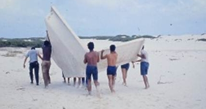 A media mañana se recibió la orden del Capitán Yesid Pardo de lanzar los botes PT al agua y proceder a desembarcar los elementos pre-fabricados. La razón de proceder de inmediato se debía a que el Capitán Pardo, tenía la certeza que después del mediodía, las condiciones del mar lo harían imposible. Empezamos a trasladar los primeros elementos del remolcador a la lancha de desembarco. Uno de los cabrestantes falló y el elemento cayó a esas aguas tan agitadas. De inmediato el Capitán Pareja se lanzó al mar en un bote inflable con dos boyas color naranja también inflables. Fueron momentos de intenso dramatismo. Con decisión y valentía se aseguró el elemento antes de que se perdiera en las profundidades y se logró recuperarlo. Le solicité al Capitán Pareja desembarcar primero con mi equipo de montadores, herramientas y elementos con el fin de escoger y preparar el terreno, para ganar tiempo. El Capitán un poco escéptico del desembarque de los elementos, consideró que yo si podía desembarcar.