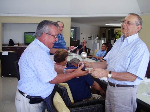 Pero si eso sucedió en la cancha, en el área social mientras los Jorge Ruiz, Héctor Porras y Papayo Rubiano-Groot, sumaban y restaban los golpes para obtener los resultados, los participantes, luego de una merecida ducha y con tres kilos menos de peso, pasaron a degustar uno que otro traguito, que servía para esperar y escuchar sin nerviosismo, los resultados que hacían recordar al famoso profesor Polo, cuando entregaba las notas de matemáticas en la inolvidable ENC. Luego de reuniones, brindis, mensajes twitter (hasta de Uribe, pero de Eduardo Uribe / 35-069) y uno que otro traguito, al fin… Ruiz, Porras y el Papayo dieron a conocer la ansiada, apetecida, anhelada, esperada y deseada tabla de resultados, la cual, con los respectivos premios quedó así: