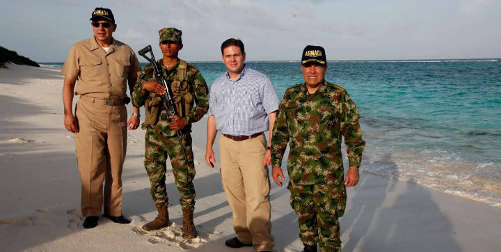 "Al oriente del meridiano 82 todo es Colombia", les recordó en su recorrido a los infantes en el cayo Serrana. Pinzón insistió en la presencia de las Fuerzas Armadas del país en las islas, bajos y cayos del archipiélago y aseguró que esa soberanía se hace efectiva con "operaciones estratégicas, de interdicción, señalización de los cayos, las islas, y la lucha contra el tráfico de armas y la trata de personas", aseguró el Ministro. Y agregó: "Nicaragua nunca ha estado presente aquí".