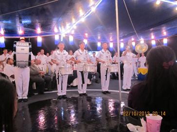 Ya en la noche es la recepción que ofrece el Comandante del Grupo de Tarea de Entrenamiento, a bordo del buque principal ROK “CHUNG MU GONG YI SUN SHIN”, con comida servida en buffet, algo similar al almuerzo de la víspera ya enunciado, palabras de cada una de las autoridades presentes, incluyendo la de los Veteranos, que fueron altamente emotivas y una pequeña muestra de su cultura y adiestramiento en el manejo de instrumentos de percusión de carácter naval-militar.