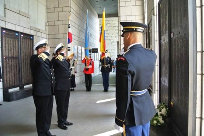 Me permito adjuntar fotografía de los VADM Hernando Wills Vélez y Cesar Augusto Narváez haciendo una ofrenda floral en la ciudad de Seúl, en el Museo de la guerra y frente el monumento a Colombia y sus caídos en combate durante la guerra de Corea .