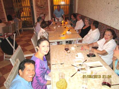 Comida en honor de Marie Laure Guillot (Cónsul de Francia en Cartagena) ofrecida por Jorge Serpa y su señora Gladys Ardila, a la cual fueron invitados el Sr Vicealmirante Guillermo Uribe y Sra., el Capitán de Navío Rafael Díaz y Sra., el Contralmirante Jairo Cardona, el Capitán de Navío Carlos Umaña Caicedo y Sra. y los miembros de la familia Calderón Guillot, en el restaurante Peruano "Cuzco" de la ciudad heroica, el pasado 31 de mayo.