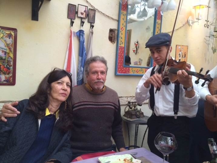 El muy apreciado Conti David Escobar / 42-044, residente en Santa Marta, viajó a Bogotá con el fin de atender asuntos familiares y también para degustar algunas viandas en restaurantes capitalinos. En la fotografía, David acompañado de su adorable esposa Josefina, degusta exquisito vino español en el Restaurante La Provance, de Usaquén, mientras un violinista interpreta melodías de Strauss. Salud… Salud… Salud…