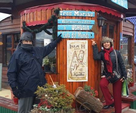 Jorge Serpa y su esposa Gladys, posando en Ushuaia, la población situada en más al sur de Argentina, que coloquialmente denominan "el culo del mundo". Este lugar Serpa adquirió energía positiva para continuar la Cyber-corredera.