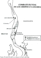 Para los días en que se inició la guerra, la fuerza naval del gobierno en el caribe consistía en los vapores fluviales “Hércules” y “Colombia”, vencedores en el combate de “Los Obispos” y los cruceros “Córdoba” y “Próspero Pinzón”, los vapores “La Popa” “Nelly Gazán”y “María Hanaberg” , además de algunos veleros auxiliares. Convencida por el desastre de “Los Obispos”, la revolución insistía en disponer de medios marítimos y fluviales para el apoyo de sus operaciones en tierra,. por lo que fueron negociados en alquiler a principios de 1900, dos vapores que se creyeron útiles para este propósito. Estos buques eran un monumento a la improvisación. El primero era un cañonero denominado “Augusto”, de escasas condiciones marineras, y reducida capacidad de transporte, que consumía excesivas cantidades de carbón; y estaba armado, además de una ametralladora, con un cañón que en la práctica era de poca utilidad debido a su corto alcance. Fue bautizado como “Peralonso” en honor de reciente triunfo de la revolución y se encargó de su comando al coronel Julio Torres. El segundo buque era un antiguo remolcador de nombre “Rayo”, al que se bautizó como “General Gaitán, y armado en guerra montándole una ametralladora en la proa. Debido a su reducida velocidad se le dificultaría operar junto con el “Peralonso”. Esta era la flotilla marítima de la revolución, para su comando, y el del “Rayo” fue designado un mercenario mexicano, el “general” Francisco Ruiz Sandoval, personaje de discutibles condiciones profesionales y lealtad. La revolución fincaba grandes esperanzas en su flotilla de guerra, la que arribó a Riohacha a principios de mayo de 1900. El general Justo L. Durán propuso al general Siervo Sarmiento, jefe civil y militar de la revolución en el Atlántico, una operación para estrenar su “marina de guerra”: atacarían por tierra y por mar la ciudad de Santa Marta; derrotadas allí las fuerzas gobiernistas, continuarían hacia Ciénaga en donde se unirían a una guerrilla liberal que operaba en la zona; posteriormente tomarían a Barranquilla para hacerse de nuevo al dominio del río Magdalena con el fin de auxiliar al ejército liberal, ya que se sabía que el gobierno estaba concentrando fuerzas en Santander para presentar una batalla definitiva. El plan del general Durán era iniciar la mencionada operación el 19 de mayo de 1900, sin saber que en estos momentos se estaba librando el combate de Palonegro, en el cual las fuerzas terrestres de la revolución sufrieron una derrota de la que nunca se podrían recuperar. El día 20 de mayo falleció el general Siervo Sarmiento, lo que constituyó una gran pérdida para la revolución, pero en todas formas decidieron iniciar a partir del 1º de junio la operación aprobada por el fallecido comandante, conociendo también que las fuerzas del gobierno, ante la llegada de los buques revolucionarios habían fortificado la Bocas de Ceniza. En cercanías de Riohacha, al zarpar la flotilla de mar de la revolución al mando de Ruiz Sandoval, por un error en la maniobra, el “Gaitán” colisionó al “Peralonso”, causándose en los dos buques averías tales que impidieron su participación en la operación, a lo cual se atribuyó posteriormente su fracaso. Reparados los dos buques, zarparon hacia el área del río Sinú en misión de transporte; cumplida ésta, regresaban a Riohacha, cuando encontraron en las bocas del Sinú el transporte “María Hanaberg” que había sido blindado y artillado por el gobierno para su servicio. Tras unos pocos disparos el transporte fue capturado, y la flotilla regresó triunfalmente a Riohacha; el “María Hanaberg” fue rebautizado como “General Sarmiento”. Por éstos días ejercía la presidencia de Venezuela el general Cipriano Castro, quien había demostrado sus simpatías por la revolución liberal, pero el reciente triunfo conservador en Palonegro, le había enfriado su entusiasmo, y para mostrar su neutralidad ante el gobierno colombiano había decidido rehuir los contactos con el liberalismo e incumplir las promesas que le había hecho. Pero esto no lo sabía Ruiz Sandoval. El 5 de julio, cuando la flotilla regresaba de una misión, Ruiz puso en ejecución su plan para deshacerse de la autoridad del general Justo L. Durán, y entregar los buques al general Cipriano Castro, buscando que éste lo nombrara jefe de la revolución en la costa atlántica. El coronel Efraín Juliao, comandante de la misión fue dejado en tierra, y arrestados varios oficiales, amenazando con fusilar a quien se opusiera. El “Gaitán”, remolcando al “Peralonso” puso rumbo al puerto venezolano de Carenero, desde donde Ruiz Sandoval telegrafió al presidente Cipriano Castro, y puso rumbo a La Guaira, a donde arribaron en la madrugada del 12 de julio. Ruiz dejó los buques en el puerto y partió hacia Caracas; allí el presidente Castro no quiso atenderlo, por lo cual Ruiz procedió con insolencias que le valieron ser arrestado; los buques fueron internados, y pesar de los grandes esfuerzos de la revolución, nunca le fueron devueltos. Este episodio, unido a que por las mismas fechas, el “General Sarmiento” naufragó cerca de Maracaibo, acabó con la improvisada flotilla de mar de los liberales. Nunca más pudieron organizar una fuerza naval, por lo que definitivamente perdieron la capacidad de utilizar los puertos del Caribe o el río Magdalena, lo cual a la postre fue uno de los factores de su derrota en el centro del país. LA CAMPAÑA DE