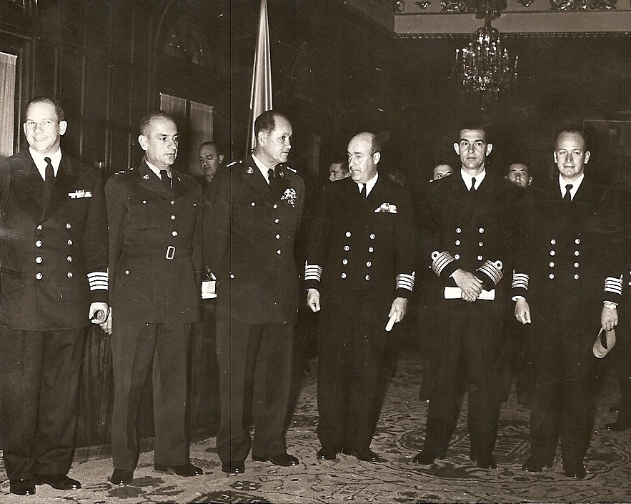 En el Palacio de San Carlos, el Presidente Teniente General Rojas Pinilla, acompañado del Ministro de Guerra Mayor General Gabriel París, entregó los diplomas a los nuevos Capitanes de Navío, entre quienes aparecen, Jaime Erazo Annexi, Augusto Porto Herrera y Ricardo Vélez Mejía